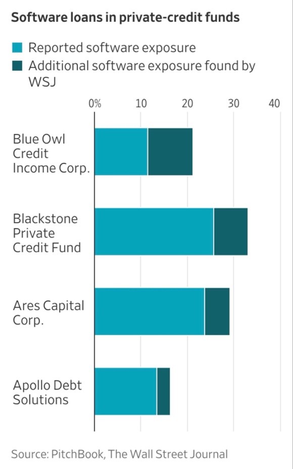 We bring this up this week because of an article that the Wall Street Journal released on Sunday that we read. The article titled “Private Credit’s Exposure to Ailing Software Industry is Bigger Than Advertised” outlines how fund managers at private market asset managers are underreporting their exposure to software in their filings. The report looks at four mega funds, the private credit funds of Blue Owl, Blackstone, Are Capital, and Apollo. They are four of the largest private market asset managers, and all four have been in the news recently due to the gating or suspension of redemptions in their respective funds.