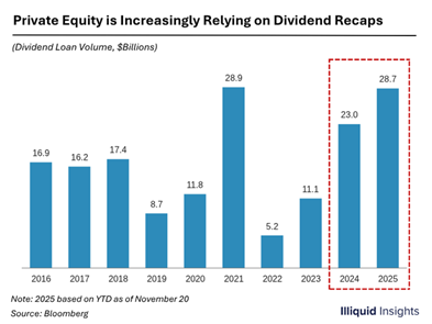 A major problem for private credit stems from private equity. Private credit often invests alongside private equity. The issue today is that private equity holding periods have increased recently due to a slowdown in exits. These funds are sitting on companies longer than ever before. These private equity funds are now relying on dividend recaps to fund distributions.