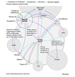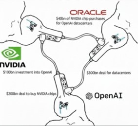 We think this circularity is a huge risk. What happens when the tap turns off, and investment in the space slows down, which decreases orders. The market is heavily reliant on strong numbers from the megacaps like Nvidia, Microsoft, and Alphabet. OpenAI and many AI companies are producing low revenues and are financing their chip and computing capacity purchases through investment, much of which is coming from the same companies they are buying chips and computing capacity from.