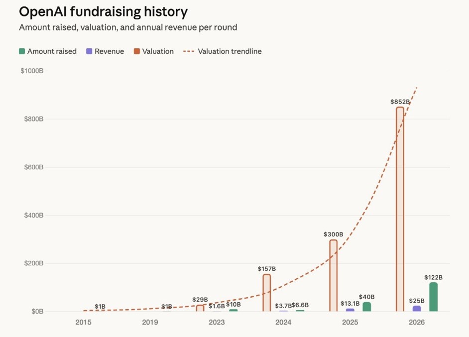 We bring this all up this week because OpenAI announced on Wednesday that it received $122 billion in new funding. The company also stated that it is elevating its valuation to $852 billion ahead of a potential IPO later this year. This new valuation makes OpenAI one of the world’s most valuable private companies and is much higher than its last raise from 2025:
