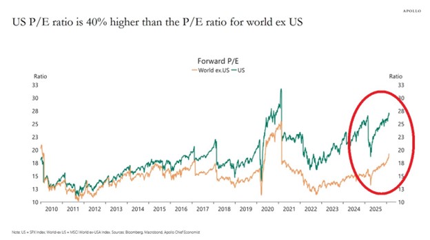 We will say that diversifying away from the U.S. does not eliminate equity risk. Today, equities in general are trading at elevated valuations, and even international equities are trading above their historical valuation means.
