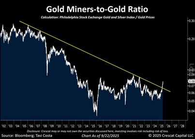 In our eyes, gold miners and other precious metal mining companies are even more attractive than physical metal at these price levels as their free cash flow continues to grow, and their margins expand. Some investors are just noticing these figures; we have been in the trade for quite some time. Miners are also attractive on a historical level when compared to the physical price of gold. According to Crescat Capital, the Gold-Miners-to-Gold ratio is at multi-year lows and just recently began to break out. We expect this breakout to accelerate and the shift into miners to continue to unfold. Some fund managers and allocators who have remained on the sidelines of gold over the last few years will not be able to pass up the value that exists in the miners in the coming quarters.